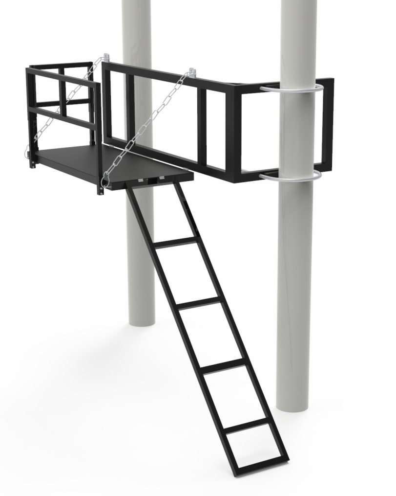 戶外柱上變壓器及電氣柜的安裝位置一般高于2.5米,需專門攜帶梯子進行檢修工作,在偏遠農(nóng)村地區(qū)以及泥濘路面梯子搬運不便,且大大影響檢修安全,影響正常工作的展開。針對以上突出問題,本公司研發(fā)出一種結構簡單、方便操作,提高工作效率的固定式安全作業(yè)登高平臺,直接安裝于設備柱上,大大方便檢修人員的正常工作展開,降低安全隱患。